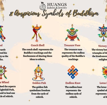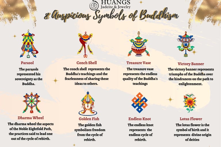 The conch shell is one of the Eight Auspicious Symbols in Buddhism, alongside the Umbrella, Golden Fish, treasure vase, Lotus Flower, Endless Knot, Victory Banner, and the Dharma Wheel. Together, these symbols represent the offerings made by the gods to the Buddha right after he reached enlightenment.